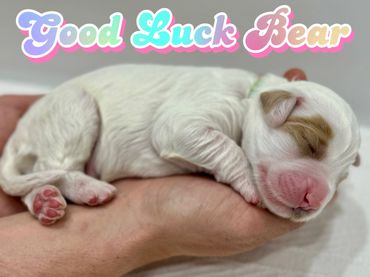 Good Luck, or Lucky as we like to call him, is a mellow, chill boy. He prefers to be in our arms or by our feet as opposed to playing and will likely grow to be a giant lap doggy. Lucky is very focused and will likely be easy to train, he sits up at attention, makes great eye contact, and has just a really great calm focus about himself. Lucky is the largest in the litter and will likely grow to be around 60lbs.