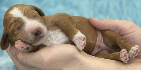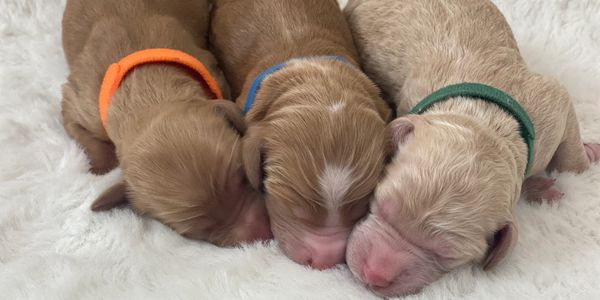 Thumper is such a sweet little boy, he has the Orange Collar. Thumper was born 5th and has so far been super easy going. Coat colors can change in the first few weeks but so far this little guy looks like he will be a solid red.