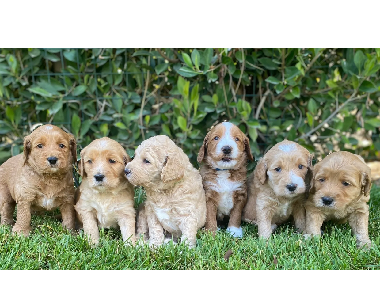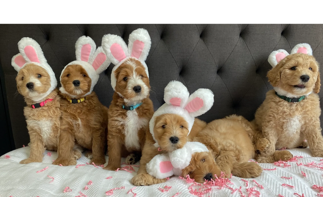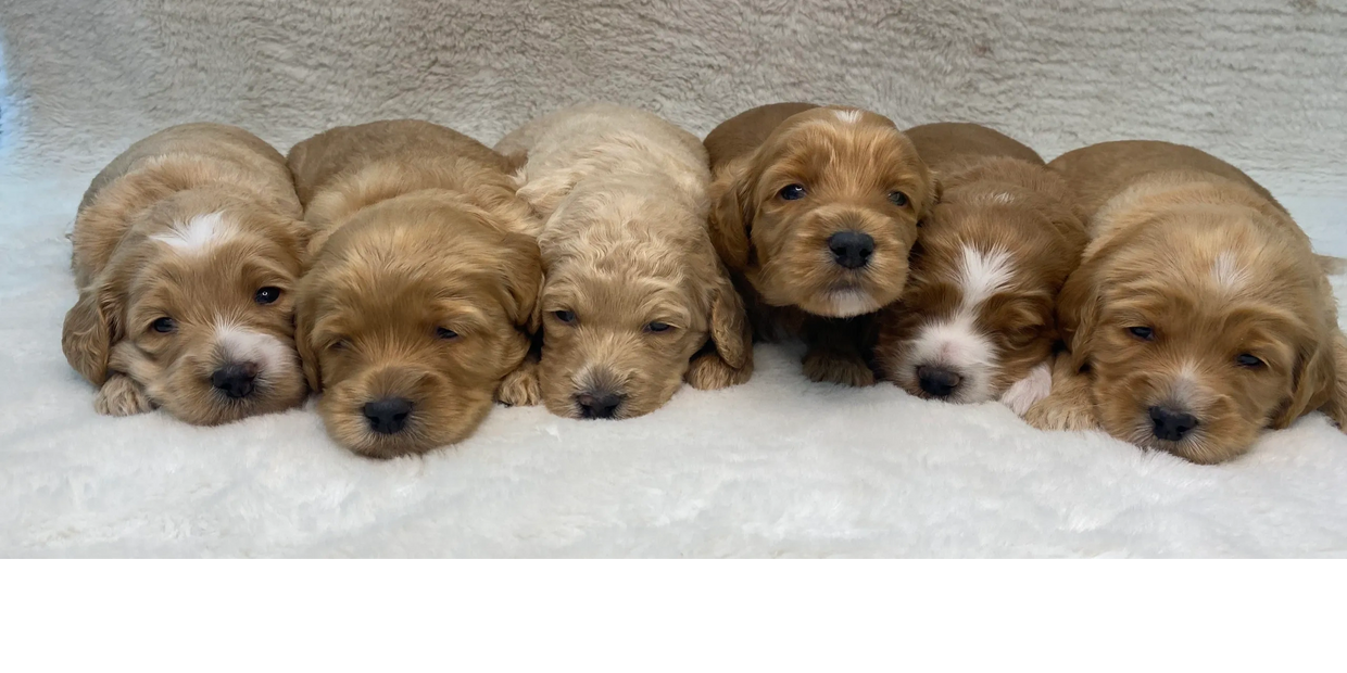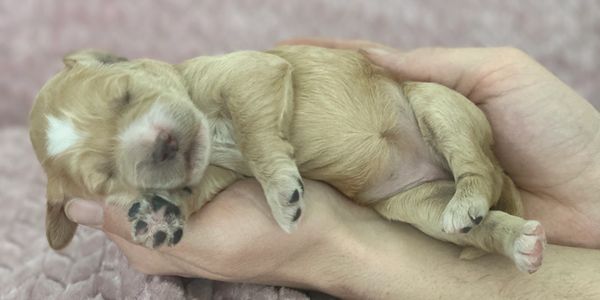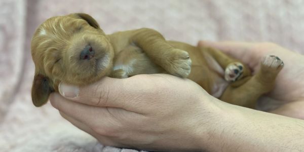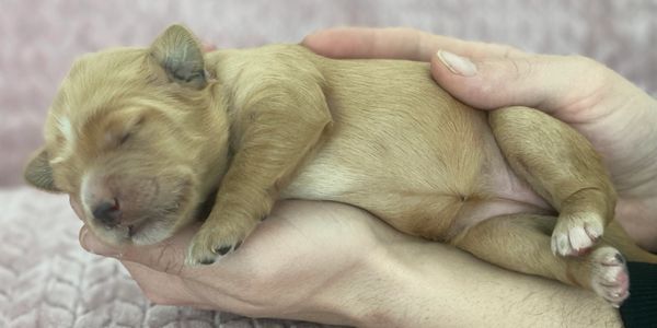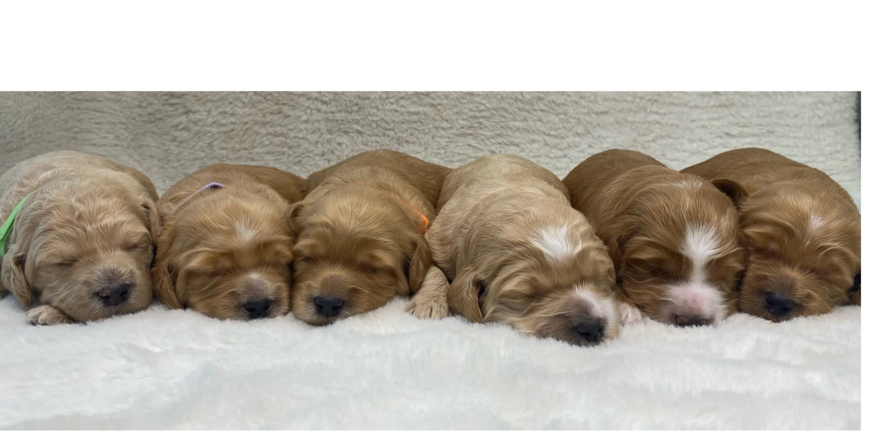 Elsa's pups are 5 weeks old! This week went by so fast, lots of playtime and socialization. They are weaning more and more from Mama, lots of potty breaks outside, we spend alot of time making sure they understand that we always potty outside. At this stage they still need lots of rest, they will play hard for about 30 mins and then they are ready for a nice snooze. At this age we still leave the door opened but just about all of them want to snuggle up inside the crate, Its a safe cozy spot for them. A few things becoming more apparent as they get a little older, Honey Bunny is the little one in the group. Bugs who is one of the larger ones has a much wavier coat then his siblings. Thumper has a nice solid coat that has faded a bit since he was first born, he will most likely be apricot. Lola girl has been a little bit more shy than her siblings, but has really come out of her shell this week. Heres a few candid photos from the week, along with their individual photos.