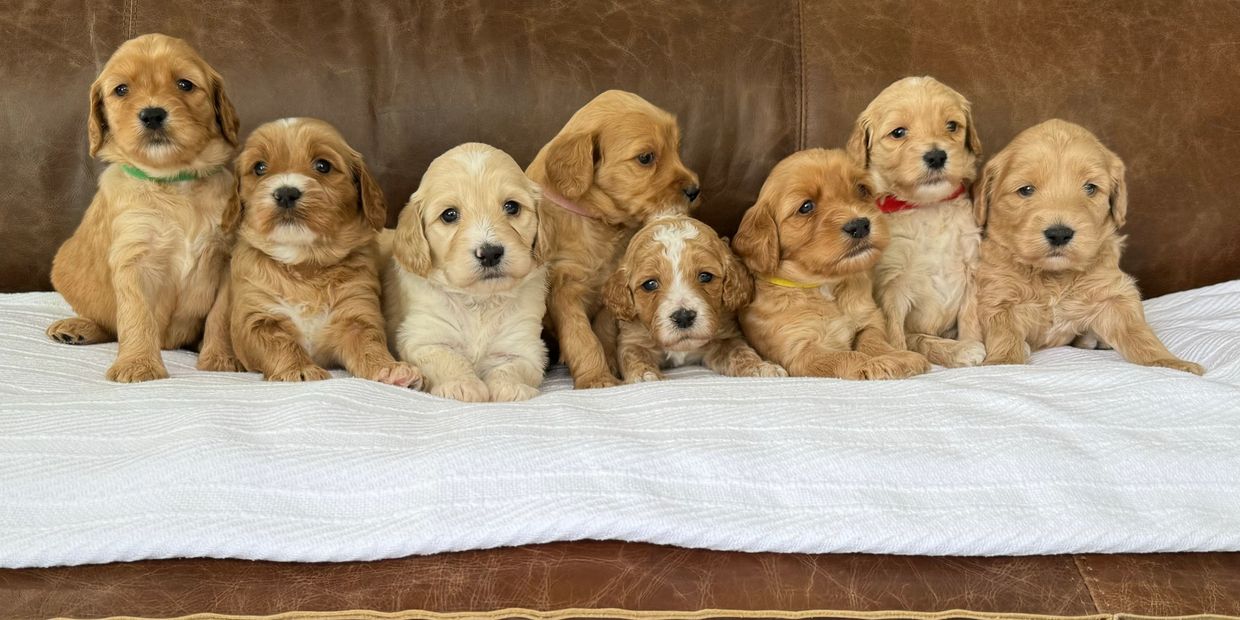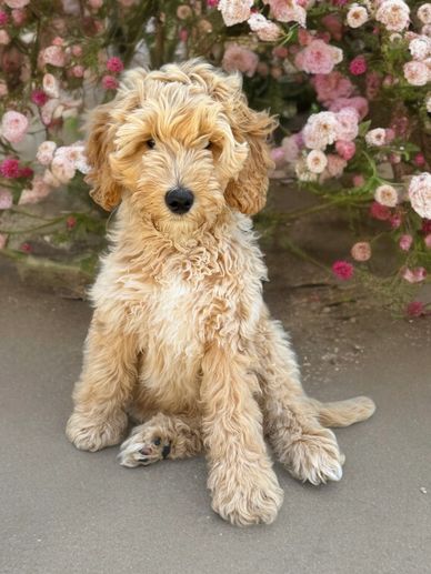 Elsa‘s Farewell litter is 5 weeks old! Time is flying by so fast with this group, its hard to believe they will be leaving us in just 3 weeks. Elsa and Winston really hit it out of the park with this group. Such a sweet gentle bunch we are thoroughly enjoying each and every moment we get to spend with them. They are enjoying puppy mush and regular trips outside now. Valentina, Romeo, Casanova and Stud Muffin are very confident outside already whereas Cupid, Aphrodite, Sweet Pea, and Cupcake prefer staying closer to mom. Sweet little Cupid with his adorable curls and precious little Aphrodite continue to be the smaller ones in the group. The very handsome Stud Muffin is definitely the largest in the group. Cupcake, although smaller than her brother Stud Muffin is the largest girl. We are so happy with where this group is at. This week we will continue our trips outside often the idea is to start to instill early, that we potty outside. The hope is that when your baby comes to you, they have a great head start towards potty training. Here they are at 5 weeks (their little faces just keep getting cuter)!