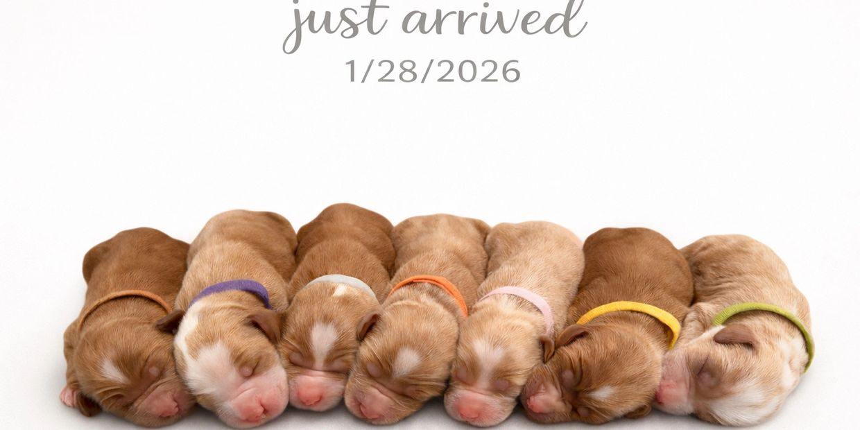 Foxys pups arrived Wednesday Jan 28th. Mama started labor at about 11 am, with her first baby, a boy (Baby blue) being born just after noon. Her final puppy, a girl, (orange collar) was born at 7:48 PM. In all she had 7 sweet babies. 4 girls and 3 boys. There is some absolutely beautiful markings on this bunch. Mama and babies are doing wonderful. Litter theme coming at our 1 week Pupdate.